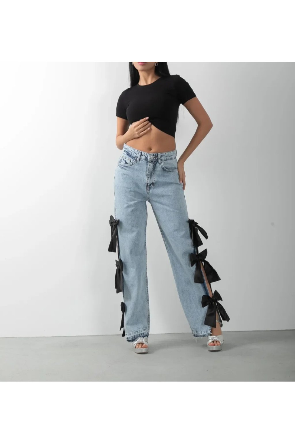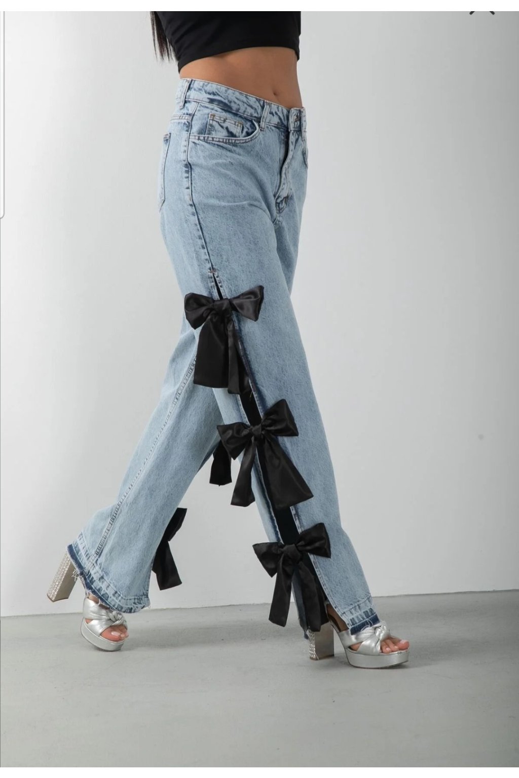 Trendy světle modré džíny, které promění každý outfit v nepřehlédnutelný. Volnější střih s vysokým pasem zajišťuje pohodlí, zatímco černé saténové mašle na nohavicích dodávají výrazný a originální detail. Tyto kalhoty jsou perfektní volbou pro ženy, které se nebojí být jiné a chtějí vyniknout.