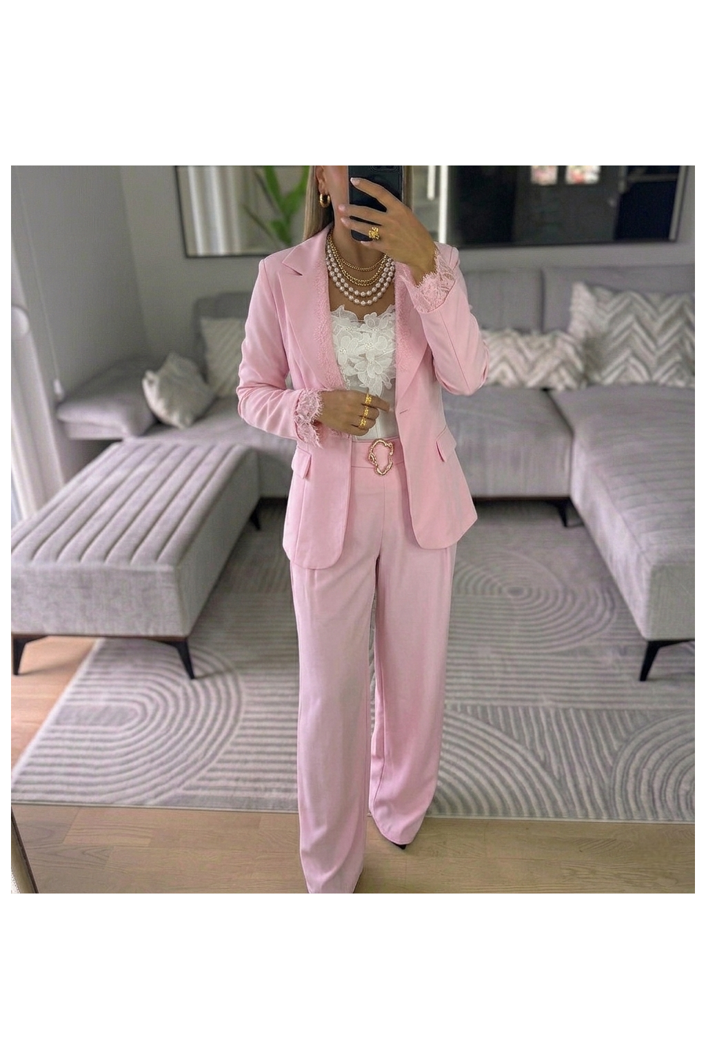 Tím, co dělá tento kousek naprosto výjimečným a nezapomenutelným, jsou nádherné aplikace z jemné "eyelash" krajky. Tato precizní krajka tón v tónu rafinovaně lemuje vnitřní linii klop a zdobí okraje rukávů, odkud jemně přesahuje ven. Sako má mírně vypasovaný střih, který krásně lichotí ženské siluetě, klasické fazonkové klopy a designové patkové kapsy.