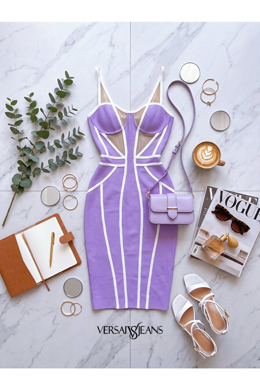 Fialové formující bandážové šaty s bílým lemováním a síťovinou