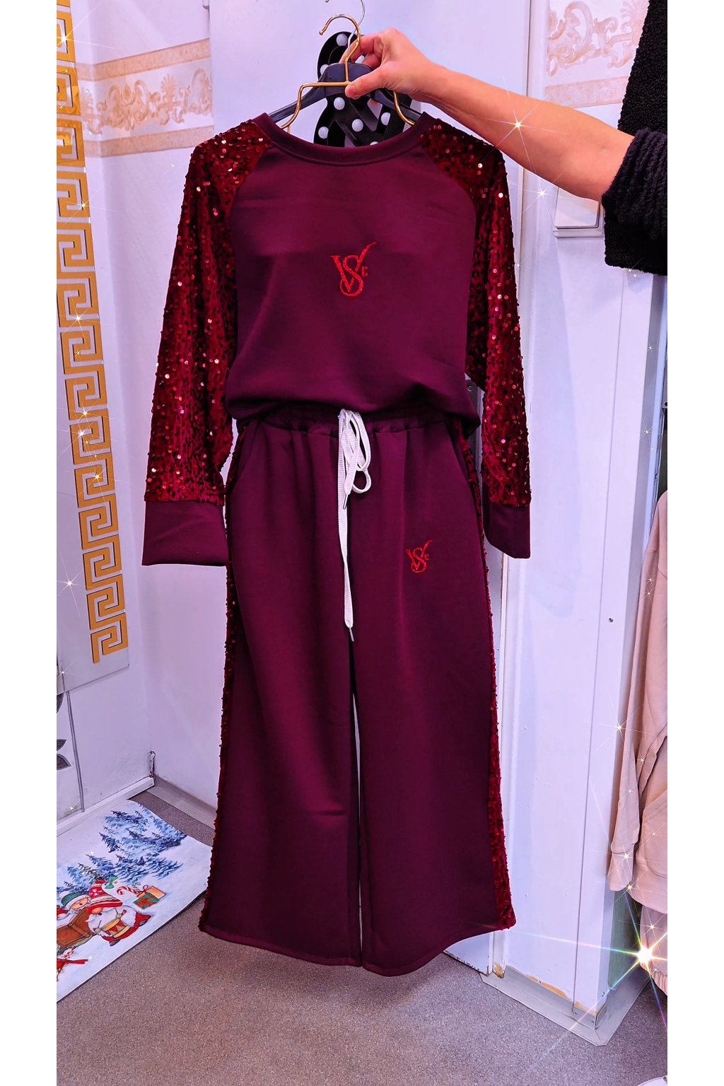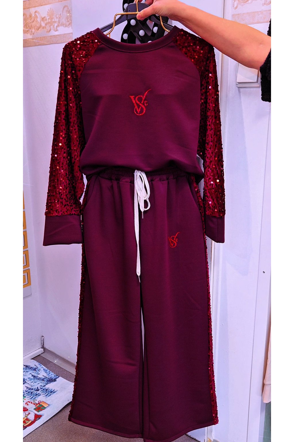 Designové detaily: Hluboký vínový odstín dodává soupravě eleganci. Mikina s kulatým výstřihem je ozvláštněna rukávy pošitými flitry, které se krásně třpytí. Kalhoty mají pohodlný pas na šňůrku a flitrový lampas na boku, který opticky prodlužuje postavu. Na hrudi i na kalhotách najdete decentní vyšívané logo.