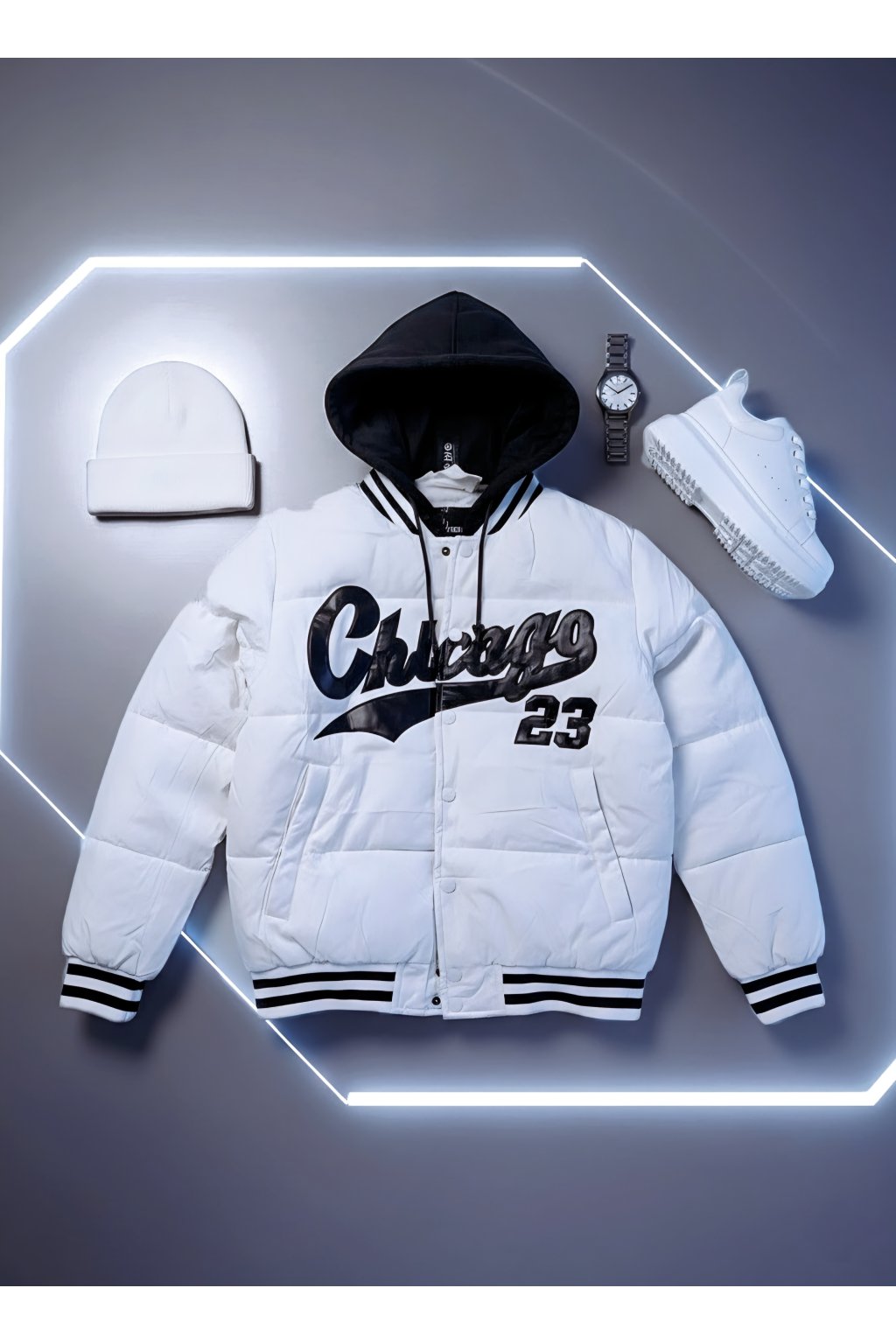 Dodej svému outfitu sportovní šmrnc s touto ikonickou bundou Chicago 23. Moderní design je doplněný kapucí a výrazným potiskem na hrudi, který okamžitě upoutá pozornost. Bunda je vyrobená z lehkého, ale hřejivého materiálu, takže tě spolehlivě ochrání před chladem.