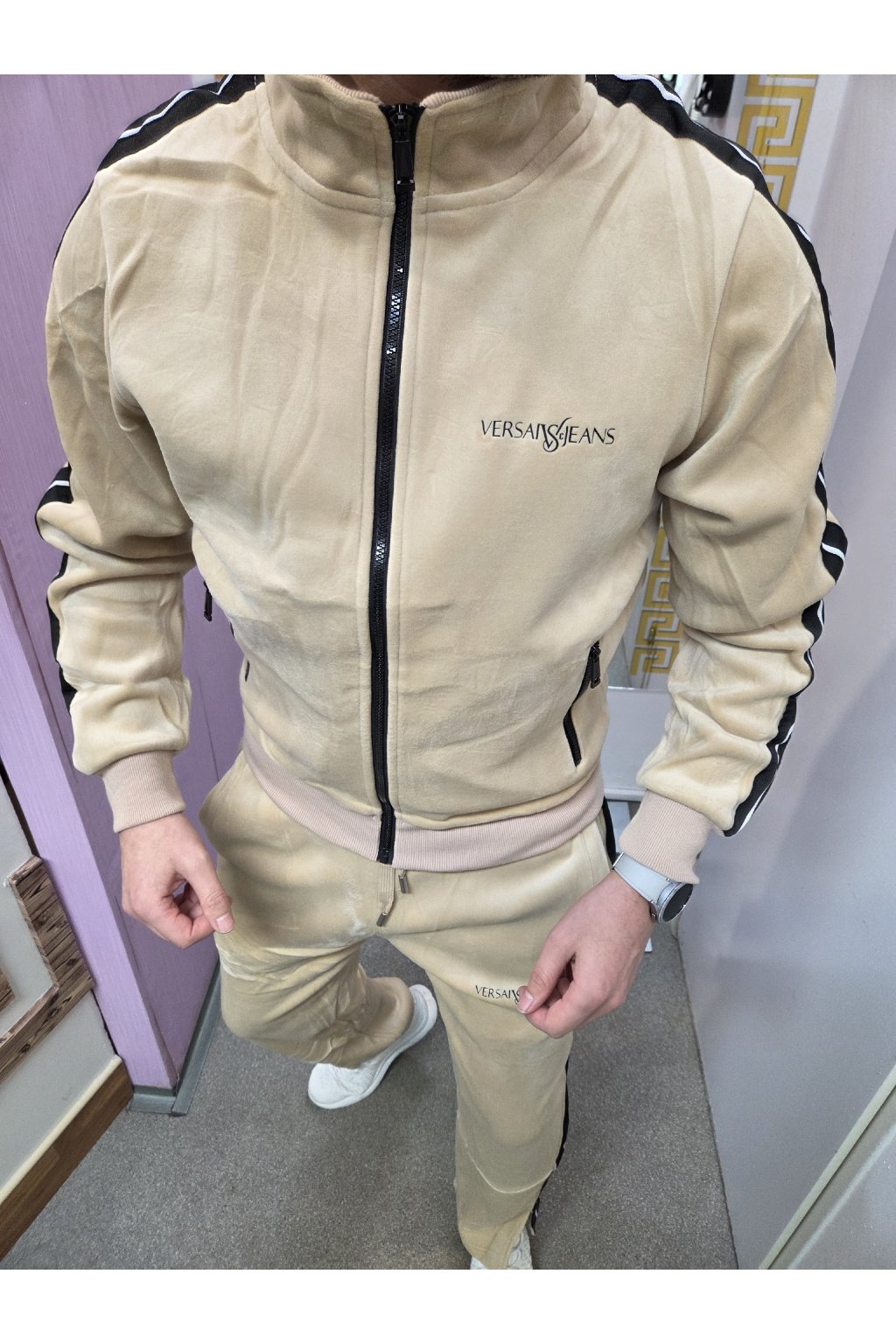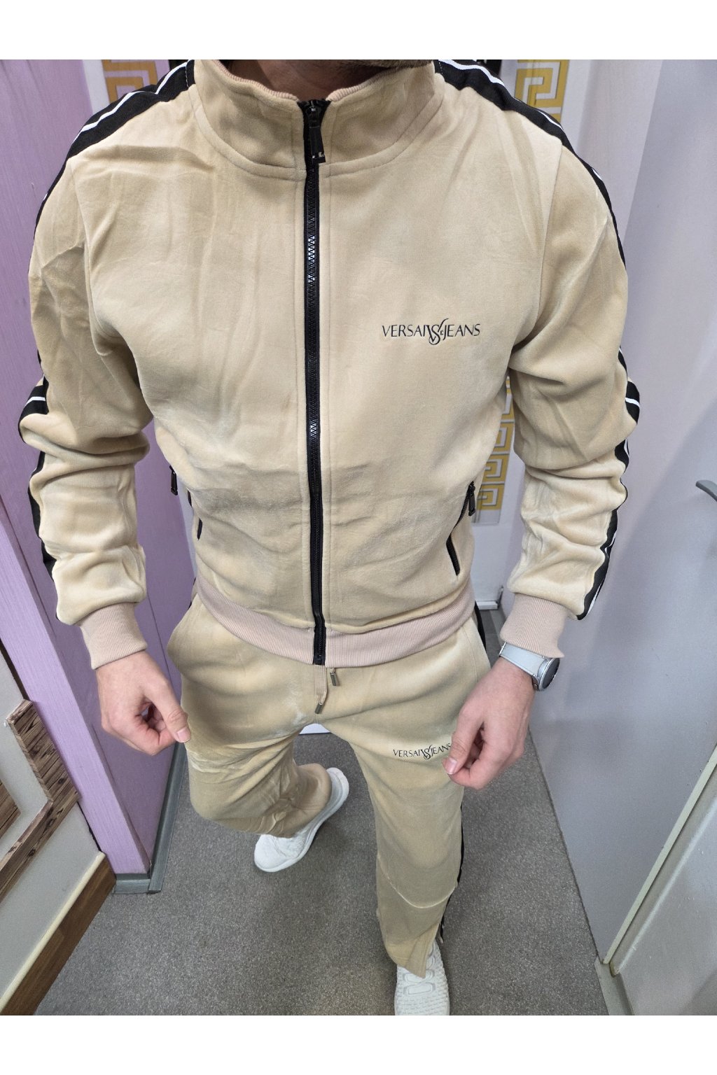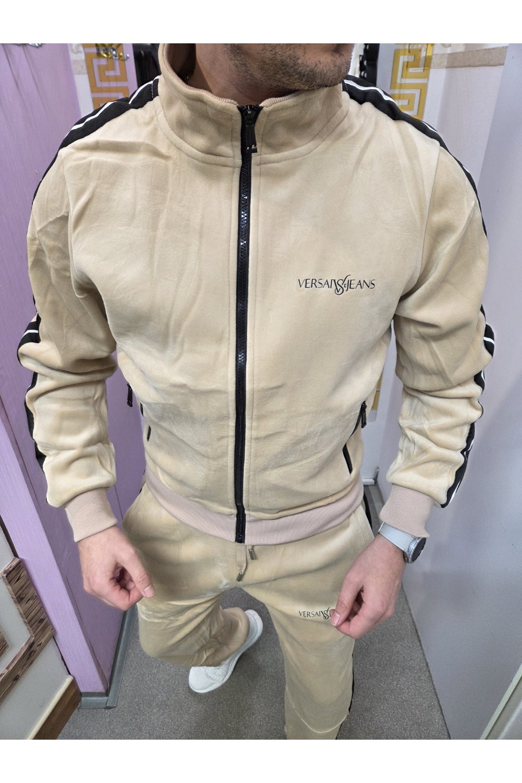 Stylová pánská souprava Versai Jeans vyrobená z jemného semišového materiálu, který působí luxusně a je maximálně příjemný na nošení. Béžová barva v kombinaci s černými kontrastními pruhy dodává moderní a elegantní vzhled.