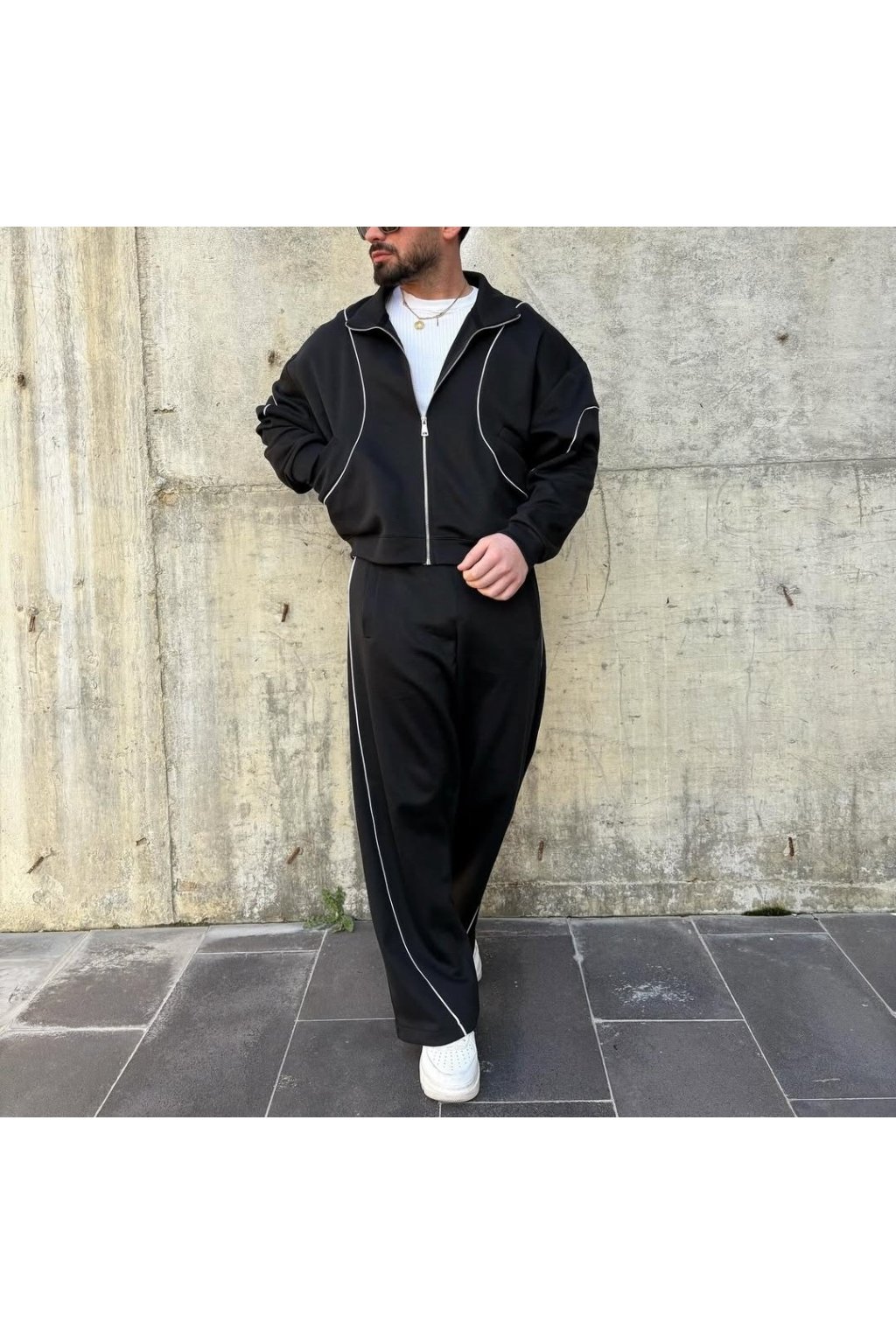 Stylová a moderní pánská souprava v černé barvě s kontrastním bílým lemováním, která přináší sportovní eleganci a pohodlí v jednom. Horní díl tvoří mikina do pasu na zip s límečkem a praktickými kapsami, spodní díl pak volnější teplákové kalhoty s postranními pruhy a elastickým pasem.