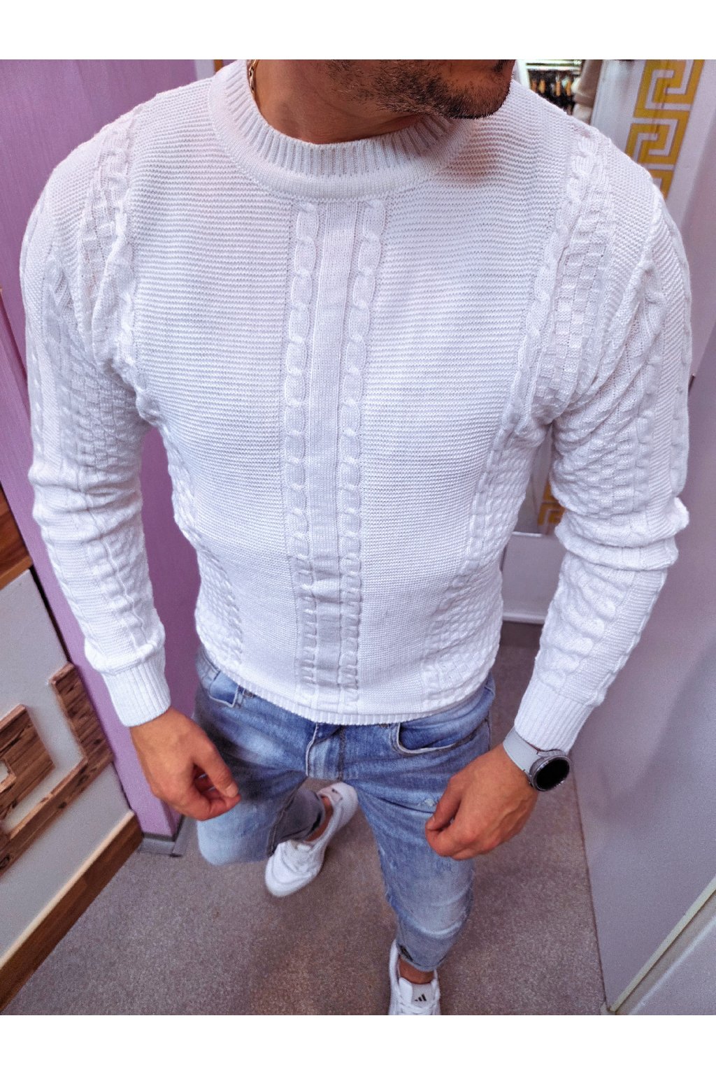 Elegantní pánský svetr v čistě bílé barvě, který díky pletenému „cable knit“ vzoru dodá každému outfitu moderní a upravený vzhled. Materiál je měkký, kvalitní a příjemný na těle, ideální pro každodenní nošení.