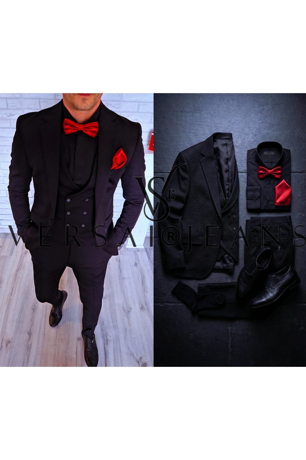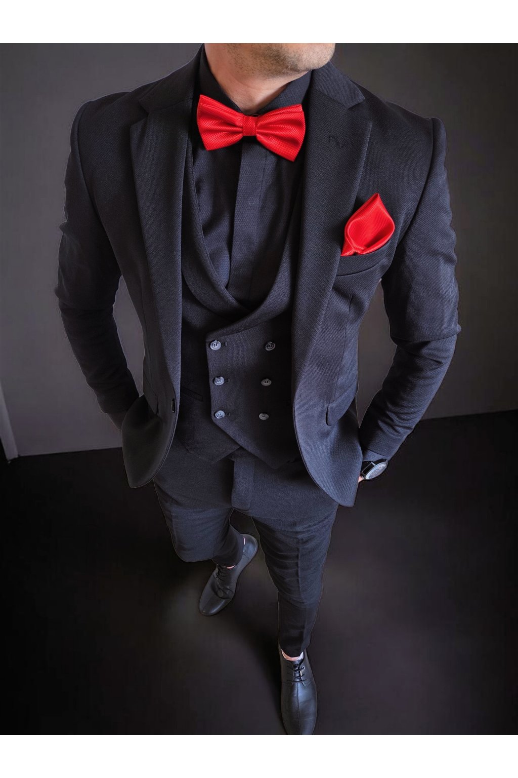 Dominantou tohoto setu je stylová dvouřadá vesta, která dodává celému outfitu punc luxusu a formálnosti. Oblek je ideální pro "all-black" styling (černá košile i oblek), který působí tajemně a sofistikovaně. Na fotce je outfit oživen výrazným červeným saténovým motýlkem a kapesníčkem, což vytváří dramatický kontrast ideální na večerní události.