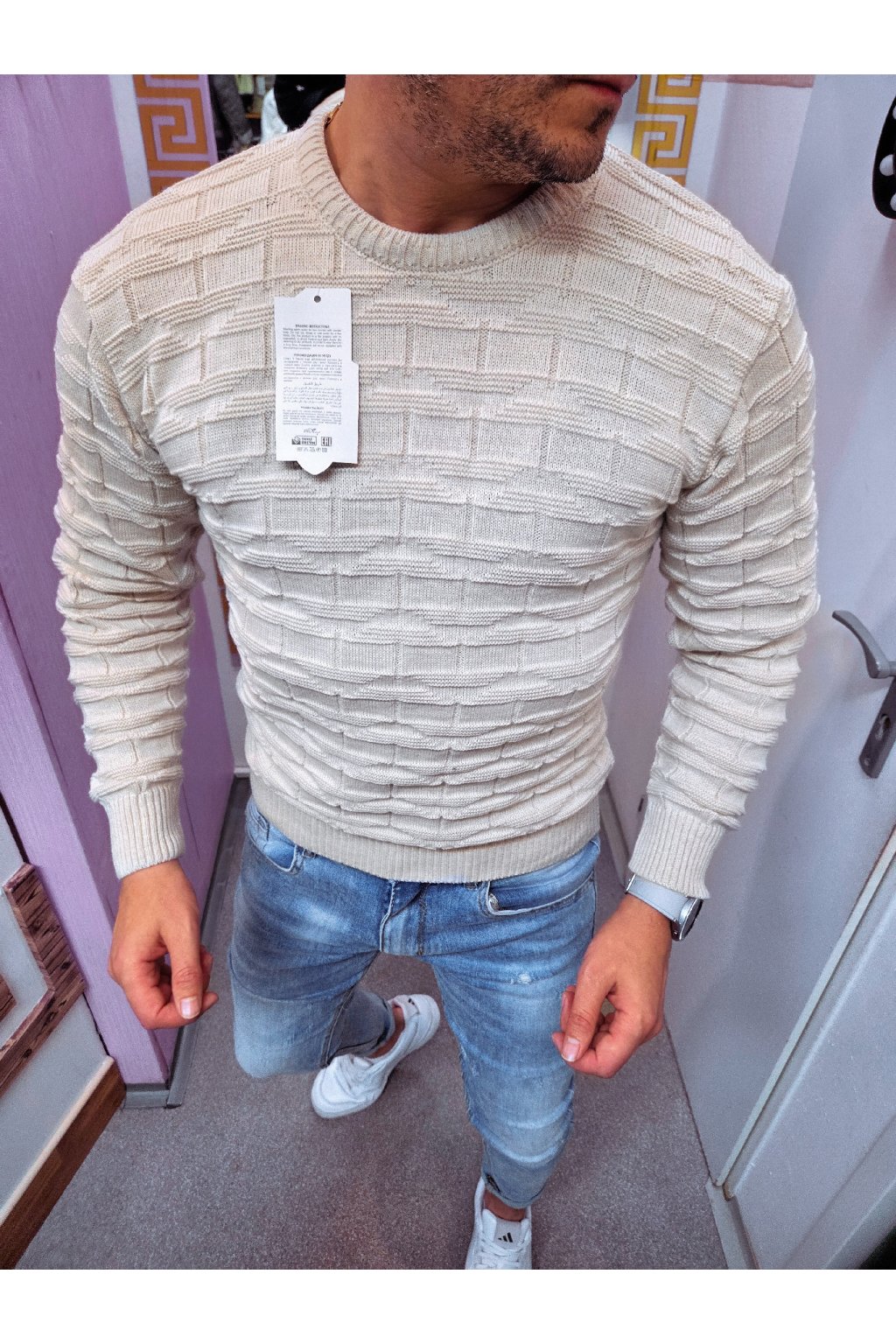 Stylový pánský svetr v moderní krémové barvě, který zaujme výrazným reliéfním vzorem připomínajícím cihlovou strukturu. Je vyroben z jemného, příjemného úpletu, který se pohodlně nosí po celý den. Má klasický kulatý výstřih, pružné manžety a spodní lem pro perfektní padnutí. Ideální volba k džínům i elegantnějším kalhotám — skvělý kousek pro každodenní nošení i volný čas.