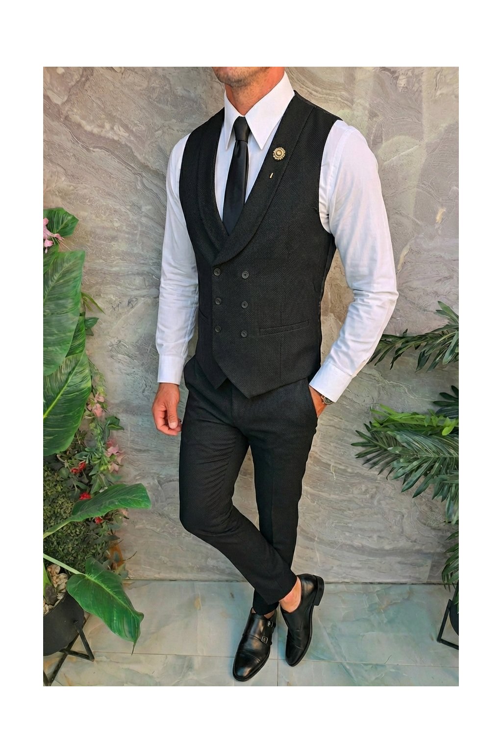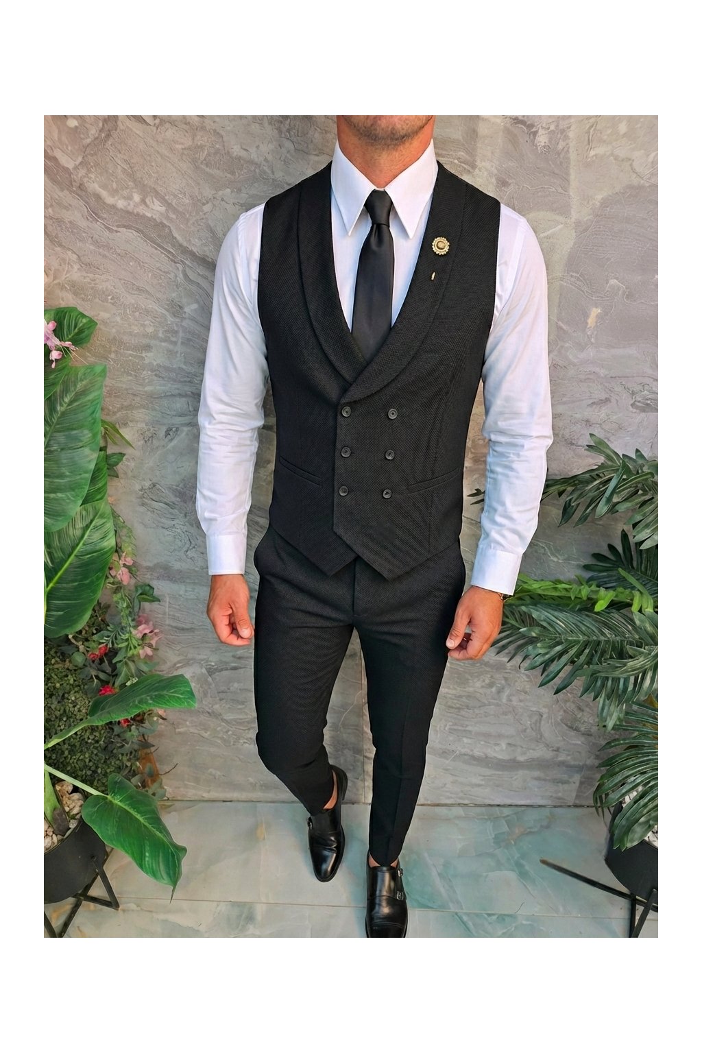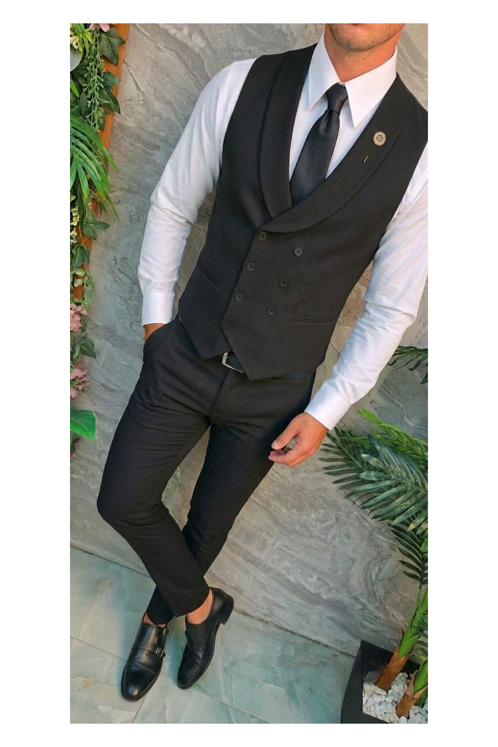 Černá vesta s dvouřadým zapínáním působí elegantně a luxusně.