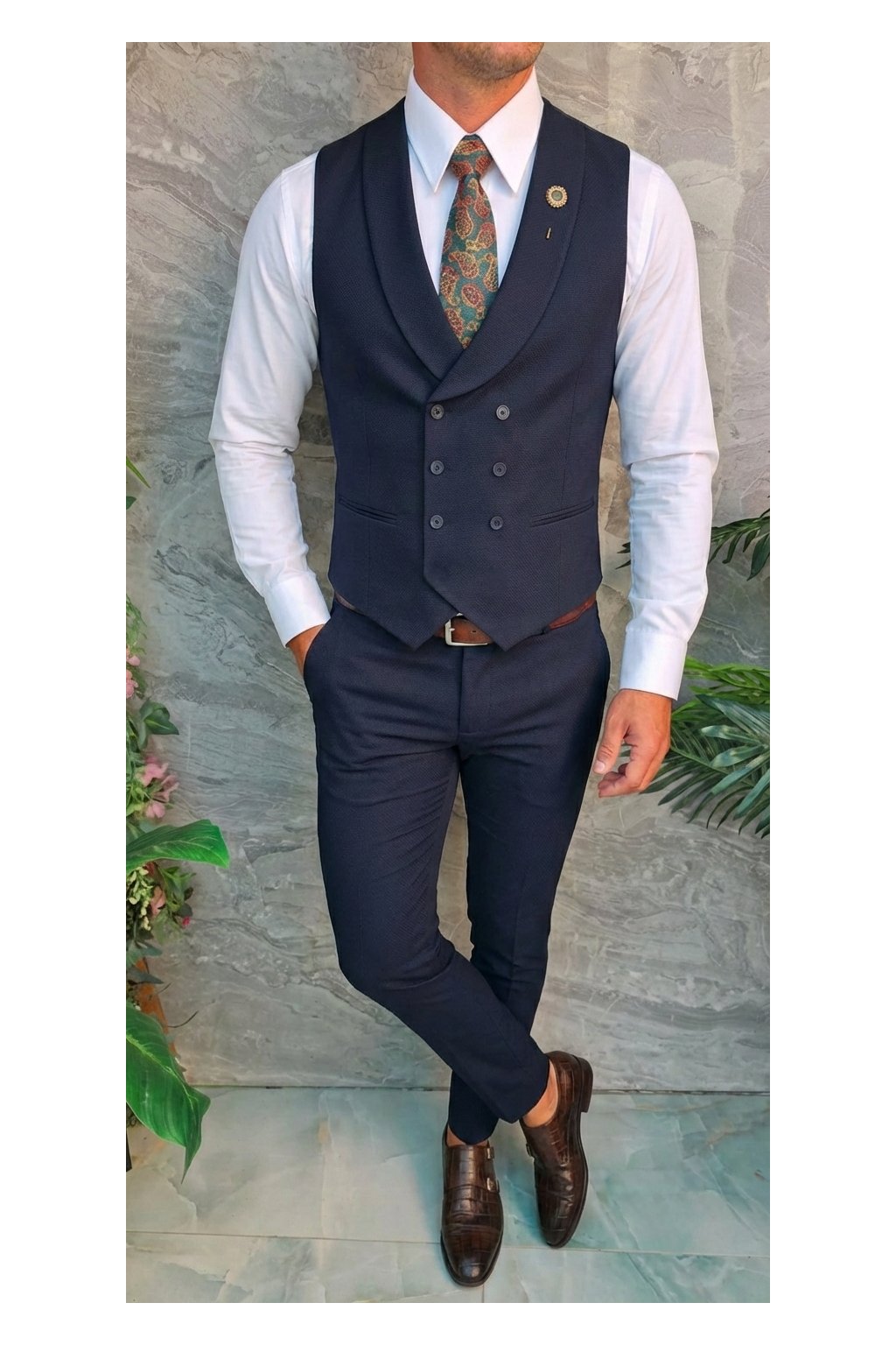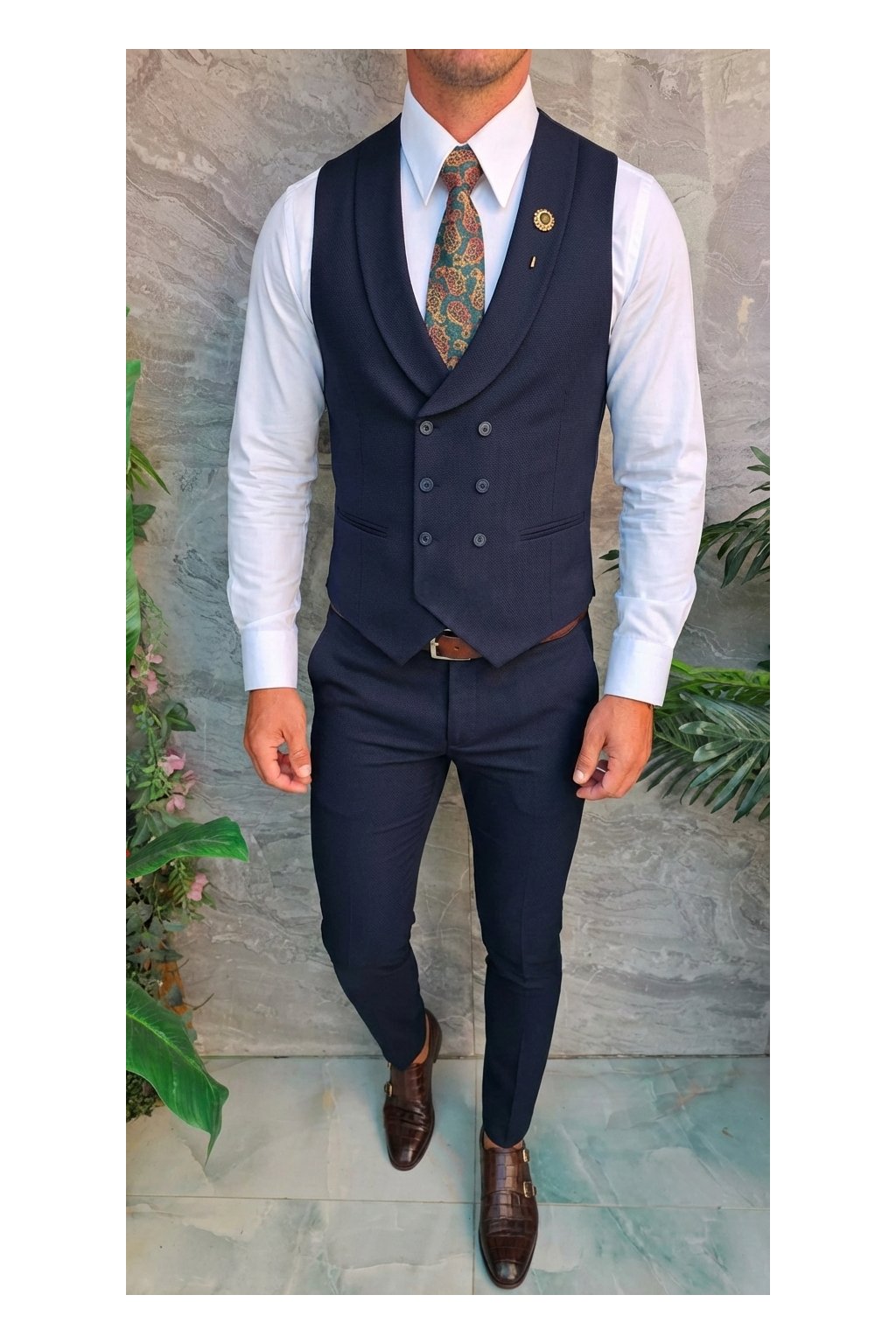 Tmavě modrá vesta s dvouřadým zapínáním působí elegantně a luxusně.