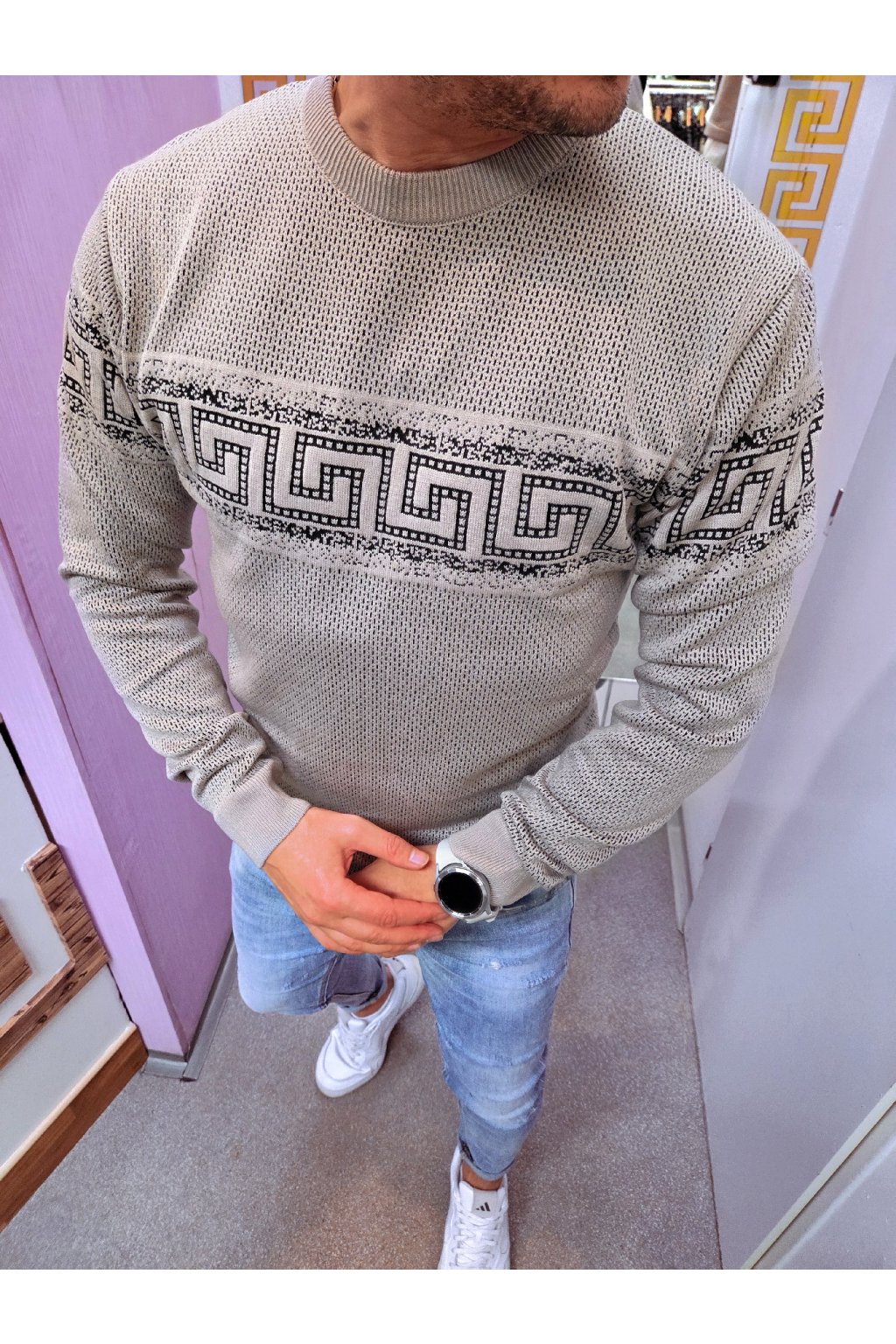 Pánský svetr s moderním geometrickým vzorem - béžový
