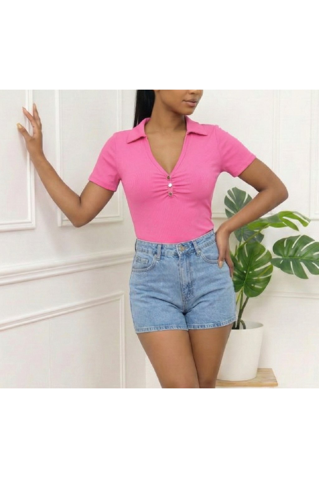 Růžové žebrované tričko s límečkem a knoflíčky