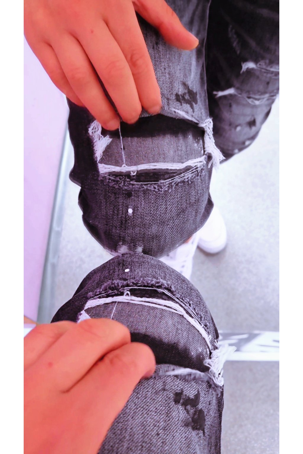 Autentický Vzhled: Džíny mají výrazný efekt seprání (wash effect) a jsou zdobené stylovými trhlinami a záplatami pro nefalšovaný, opotřebovaný vzhled.