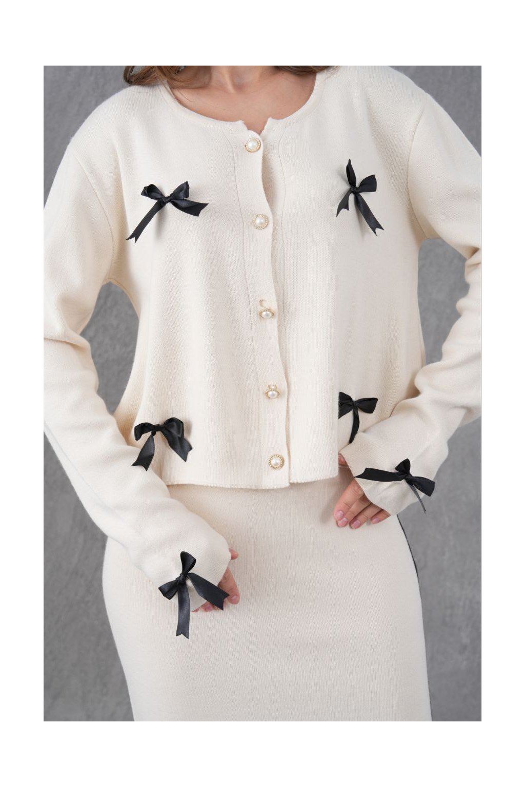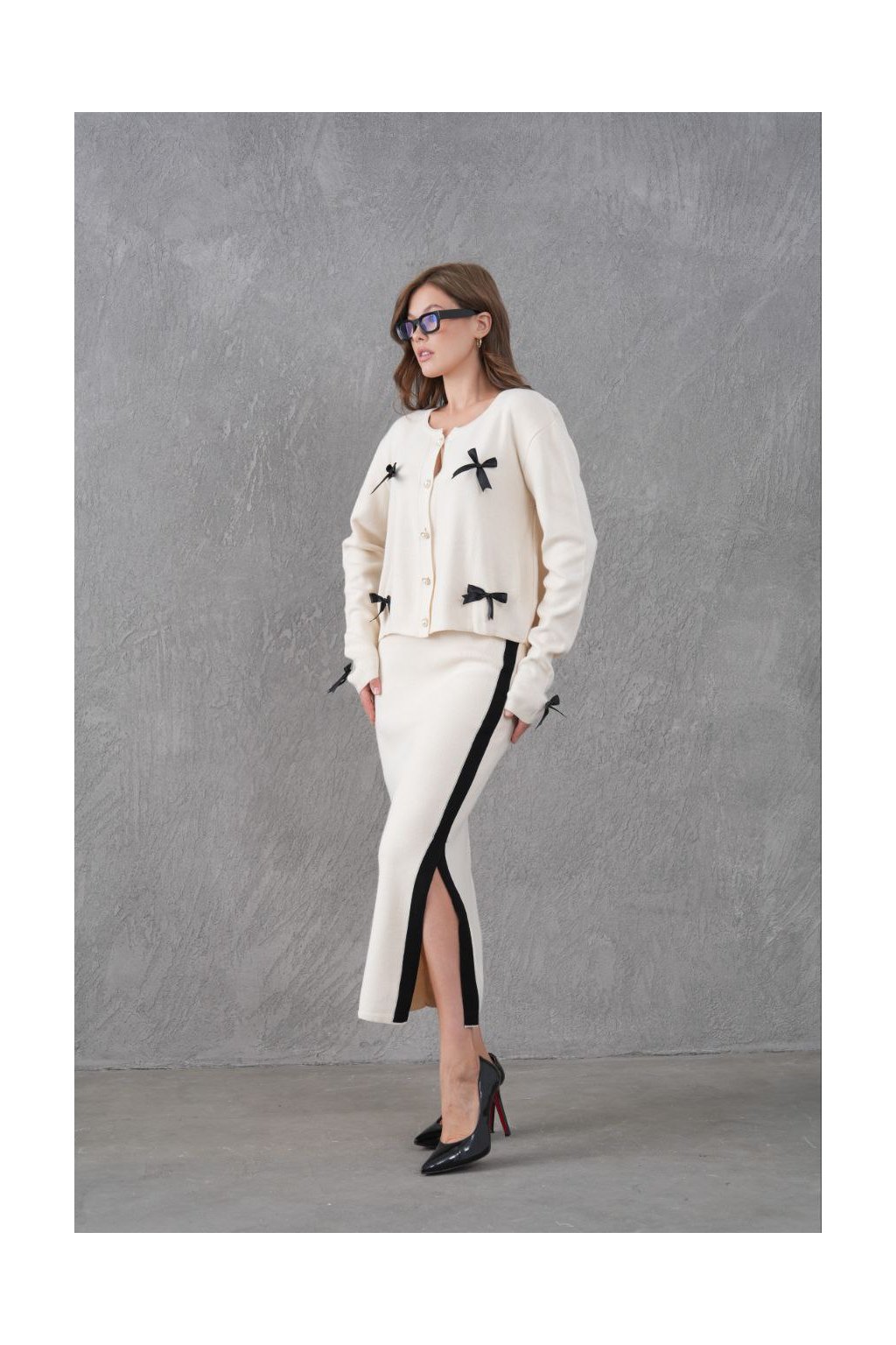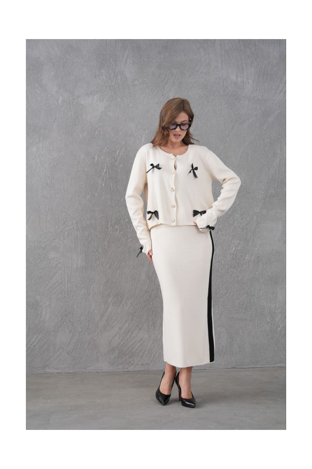 Stylová dámská souprava v krémové barvě, která spojuje eleganci a pohodlí. Set se skládá z jemného svetříku na knoflíčky, ozdobeného černými sametovými mašlemi, a ladící sukně s elastickým pasem. Černé kontrastní prvky dodávají modelu šmrnc a působí sofistikovaně.