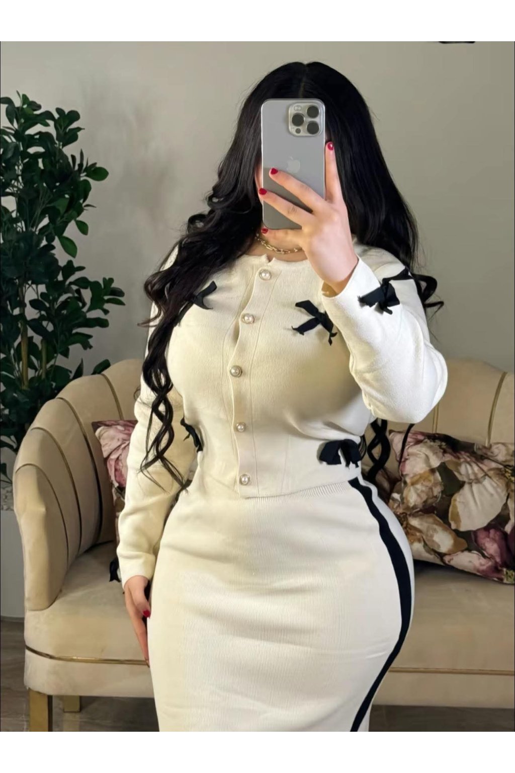 Stylová dámská souprava v krémové barvě, která spojuje eleganci a pohodlí. Set se skládá z jemného svetříku na knoflíčky, ozdobeného černými sametovými mašlemi, a ladící sukně s elastickým pasem. Černé kontrastní prvky dodávají modelu šmrnc a působí sofistikovaně. Ideální na denní nošení, pracovní schůzky i večerní posezení. Díky příjemnému materiálu se budete cítit pohodlně a zároveň upraveně.