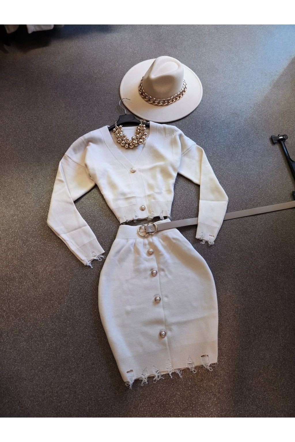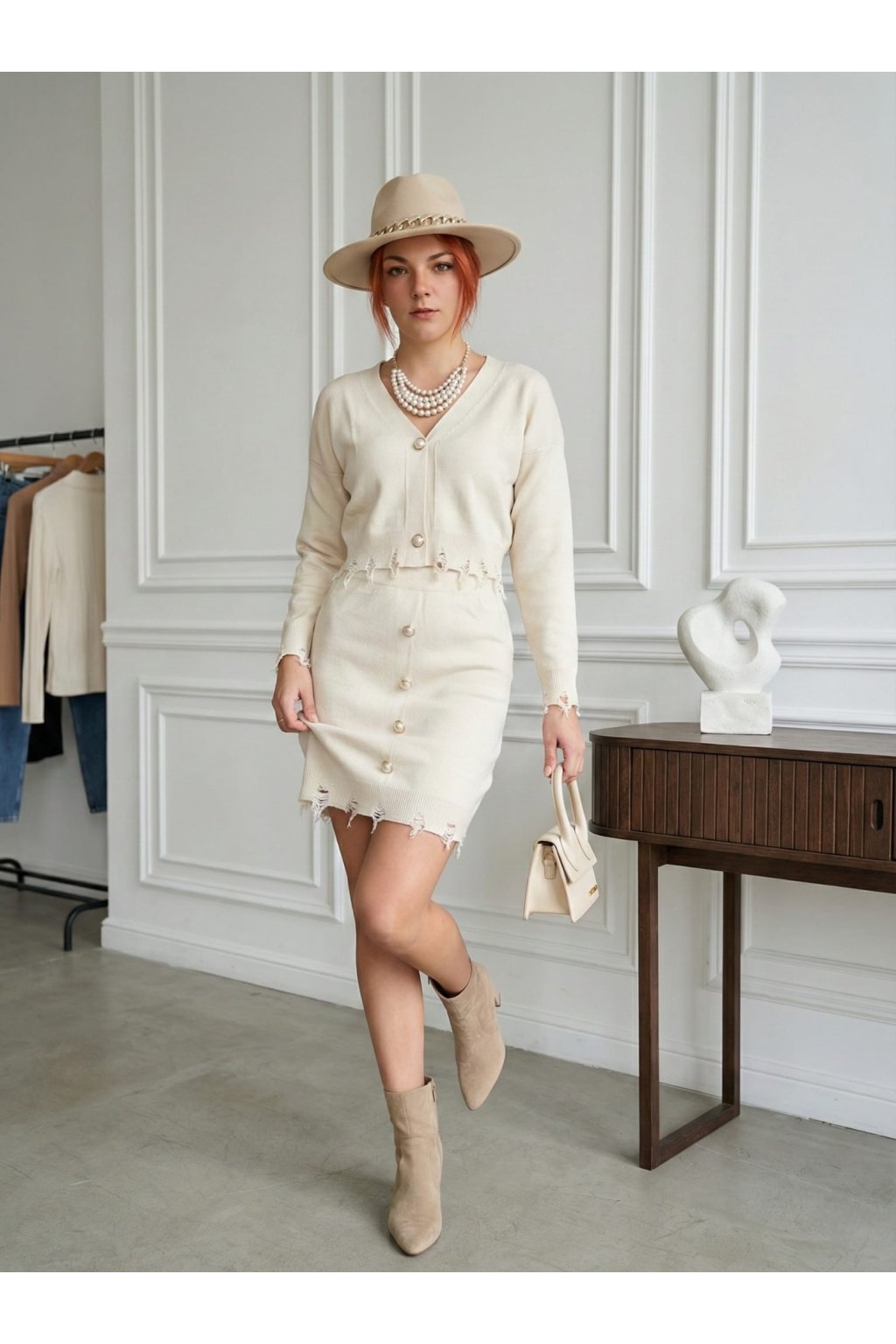 Elegantní krémová úpletová souprava, která v sobě spojuje ženskost a moderní styl. Komplet se skládá z kardiganu na perlové knoflíky a ladící sukně s elastickým pasem. Decentní „roztrhaný“ lem dodává modelu trendy nádech a kontrastuje s jemností perlových detailů.